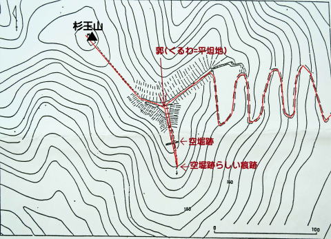 ![]() 玉郷立城址の図面と探索コース(図面は、横山勝栄氏から) |