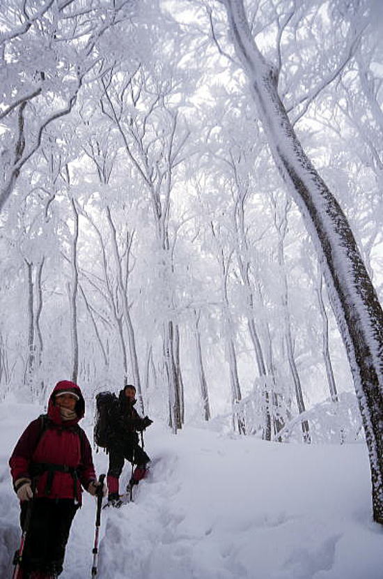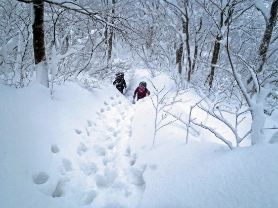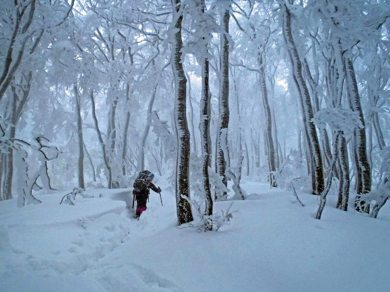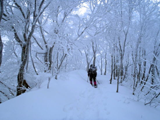 YouTubeで動画をどうぞ →こちらから (2016年バージョンは 動画を主体に してみました) 「こざく」とは、新潟県の方言らしい。漕ぐと跨ぐの混合ニュアンス。 この日の五頭山は、まさにこの言葉がピッタリの山行となった。 今冬は暖冬少雪で、我家の辺りも五頭の麓も、前日まで積雪なし。 それが昨日から今日にかけて、ようやく本格的な降雪。それでも麓はまだ10センチにも満たない程度だった。 五頭山は、冬もトレースの絶える日がないという。365日、毎日登る人がいるらしい。 この日も既に数人の先行人の跡があった。 標高400m辺りからは積雪が深くなる。昨日からの降ったばかりの新雪なので、先行者の足跡を踏み外すと、足は土が見えるほどまで、ズボッとぬかる。足跡と足跡の間には、新雪が降り積もっている。 だから、先行者の足跡を辿って、雪を漕ぐように跨ぐように進む。 これを「こざく」と、越後では表現する。 雪の朝は何処の家でも、一家の主人がカンジキをはいて、雪をこざいて道つけをしていたものだ。 今はラッセルなどというハイカラな言い方もあるが、ときには、雪をかき分けて進むラッセルよりも、「こざく」の方がピッタリ来る場合がある。 この日の五頭山行は、まさにそんな雪山だった。 麓の積雪はまだ少なかったから、スノーシューを履くまでもないだろうと予想して、念のため担ぐなら、軽いほうがいいと、ワカン(輪カンジキ)を持った。 標高500mを超えるとツボ足ではぬかりすぎて、そのワカンを履くことにした。 ところが、どうだ。 履き始めたら、バンドの通し方をすっかり忘れていることに気づいた。 寒いし、手はかじかむし、気はあせるしで、少々パニックになる。 ワカンのバンドの通し方には順番があって少々ややこしい。だから、毎年、シーズン初めには図解書で確認していたのだが、今回は、ぬかった。 少々山慣れしてきたのかもしれない。以前ほど事前の緊張感が薄れてきている。 これは、まずい。反省の余地大いにありだ。 それはともあれ。 三ノ峰山頂直下のブナ林は、期待通りに見事だった。 黒い幹に、縦に二本の白いライン。細い梢に綿菓子を吹き付けたようなエビの尻尾。霧のように舞う微細な粉雪。 今回もまた、別世界の中に浸ってきた。 2016年の初山歩、いいスタートとなった。今年も、山は呼び、山が待っていてくれる。 |