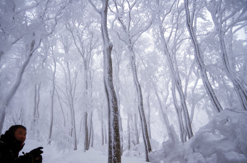 ![]() 10:20 雪中美林の入口付近、梢にも幹にも張付いた樹氷 |