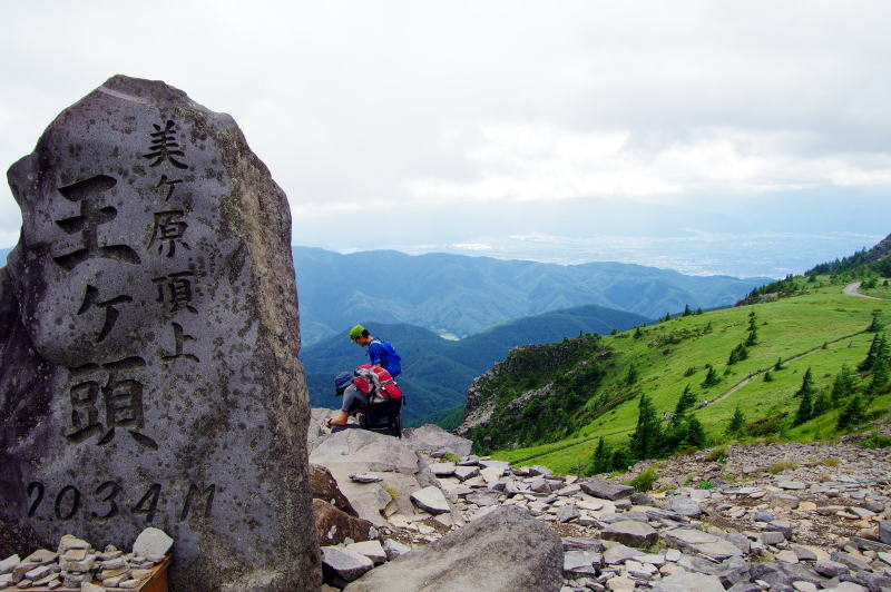 ![]() 13:44 山頂を示す大石碑 その遥か彼方に松本市の盆地 右端の車道を上ったのは十何年も前のこと |