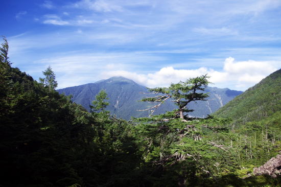 ![]() 7月30日6:40 仙水峠間近で、振り向けば背後に仙丈ヶ岳 |