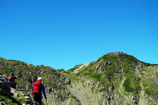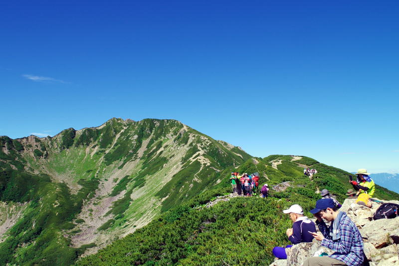![]() 10:01 稜線から仙丈山頂を見れば、こぼれ落ちるばかりの人混み |
