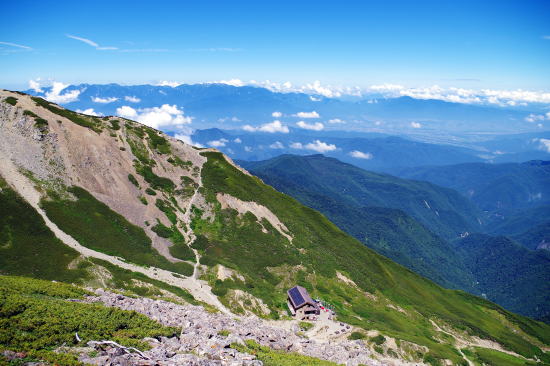 ![]() 足下を見れば、藪沢カールと仙丈小屋、遠くに木曽駒の中央アルプス |