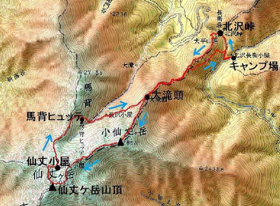 ![]() テント場発5:38-7:39大滝頭-8:14六合目見晴-8:51小仙丈ヶ岳9:10- 10:29仙丈ヶ岳山頂12:46-13:05仙丈小屋13:20-14:03馬の背ヒュッテ- 14:50大滝頭15:00-15:44近道分岐-16:19キャンプ場着 |