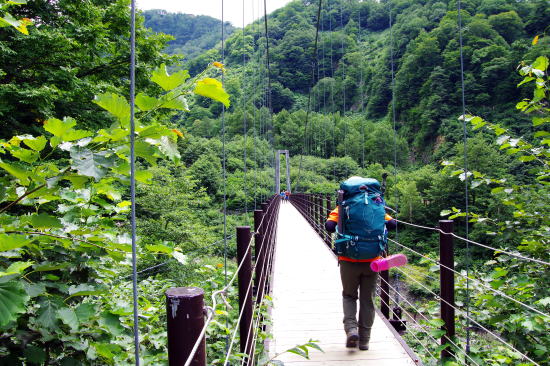 ![]() 21日11:33 テント泊荷でパンパンのザックを担ぎ別当出合の吊り橋を渡る |