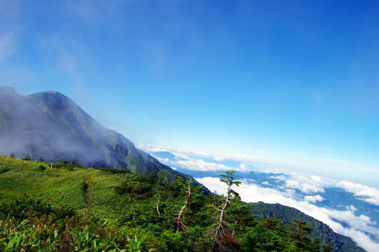 ![]() 山頂に続く左稜線は三ノ峰・古来の美濃禅定道、信仰の道 |