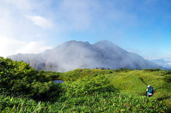 ![]() 7:02 油坂の頭まであと少し、振り返ると雲走る白山山頂、その真下にケビン |