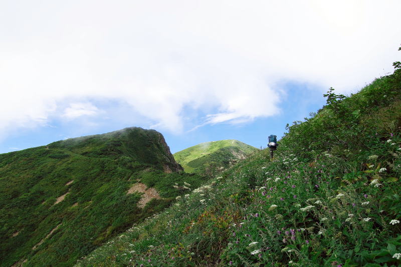 ![]() 9:00 花の稜線道 左方2342mのピークを左に巻いて行く 正面に見えるのが御舎利山、別山はその陰 |