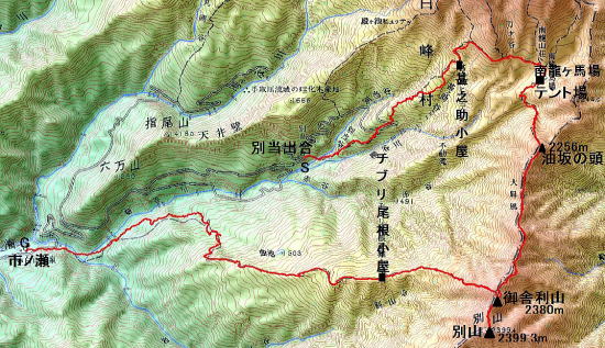 ![]() <1日目>別当出合11:30-12:17中飯場12:35-14:17甚之助小屋14:52- 15:16南龍道分岐-15:58南龍ヶ馬場ロッジ16:08-16:26南龍ケ馬場テント場 <2日目>テント場6:07-6:37赤谷沢渡渉-7:16油坂の頭7:26-9:34御舎利山分岐 -9:54別山山頂10:15-10:30御舎利山11:00-12:21チブリ小屋12:37-16:27市ノ瀬 |