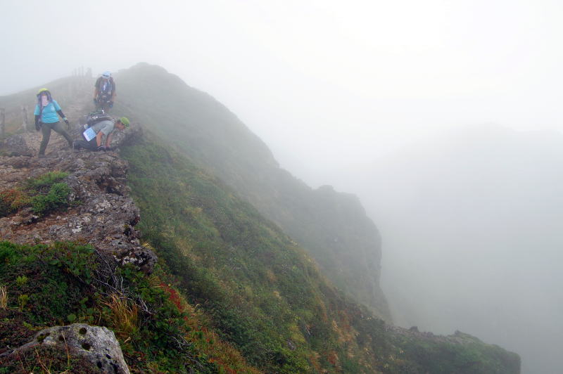 八甲田山は、火山である。 が、安達太良山のような、火山特有の荒涼とした、空恐ろしい景色は見られなかった。 ガスがかかっていたこの日、八甲田山の全容をくまなく確かめたわけではない。 が、噴火口も火口壁も、急傾斜の崩落地でさえ、殆どなにがしかの植物に被われていた。 にもかかわらず、このページの表題を、「火山の迫力」などとしてみた。 それは何故かと言うと、山中各所に爆裂でできたすり鉢状の深い火口があったからだ。 好き勝手にドカンドカンと、あちこちで次々と爆裂を起こした山という印象を持った。 麓の田代平が元々の大きなカルデラだという。 そのカルデラの南側の縁の辺りで、そのあと噴火したのが八甲田山ということらしい。 つまりは、ドッガーンと四尺玉の大花火が上がった後、派手なスターマインがドカン、ドカンと吹き上がる、あんな感じだろうか。 八甲田山の大岳、井戸岳、その間の鞍部、赤倉岳と次々に現れる大きなすり鉢状の火口を見れば、ドカンドカンと爆裂した噴火当時の様子が想像できて、かなりの迫力を感じたものだ。 この感じは、実際に登ってみなければ分かるまい。 RWでやってきて、山頂公園の辺りをちょこっと歩いて帰る観光客には、絶対に分からない。 9年前の自分もそうだった。 だから、なおのこと、今回、八甲田山の正体を知って、意外な山容に驚き、迫力を感じたのだと思う。 多分、各地の山々を巡った登山人からすれば、この程度の小規模な火山で、どこが迫力かと思われるだろう。 感覚は個人的なものだし、それは、経験に裏打ちされて生じるものだから、八甲田山の爆裂火口に迫力を感じた登山人もいたということで、解題は終わりにしたい。 さて、大岳と井戸岳の間の鞍部から、まずは大岳にピストンし、次は井戸岳へ登る。 どちらの登りも結構な傾斜。 そこを、今日は最若手のShynさんが先頭で、昨日に続いてのRunトレ。 昨日、岩木山で心拍数を上げておいたせいか、今日はなんだか調子がいい。 息も上がらず、スイスイと追い上げて、今日は二番手で後に続いた。 10月9日に向けて、なんだか調子は上がってきているような気がする。 と思ったが、井戸岳の火口壁の稜線道を歩いていて、思い直した。 深いすり鉢。 まるで、蟻地獄。 落とし穴。 春から、落とし穴に嵌っている。 4月の笹川流れ、あの強風。 6月の東根、左脹脛の肉離れ。 いずれも、レース直前までは、絶好調だった。 練習の走り込みは、質・量ともに、これまでになく快調。 それなのに、自己ベストが出るはずと臨んで、2度とも、見事敗退。 人生、どこに落とし穴があるか分からない。 各々がた、ゆめ油断召さるな。 ご用心ご用心。 かくして、八甲田の蟻地獄は、慢心を戒めてくれたのでありました。 さてさて、下山して。 酸ヶ湯温泉の千人風呂へ。 混浴の秘湯というが、ポスターのような和やかな感じでは全くなかったですぞ。 そして、この日の宿、七戸町まで行って家族村の高級ケビン。 その夜の、マラソン談義も、ずい分勉強になりました。 翌日、早速実践。 うん、なかなかいい。 いやいや、ご用心ご用心。 最終日、「風物記・青森つけたし旅」へ続きます。 |