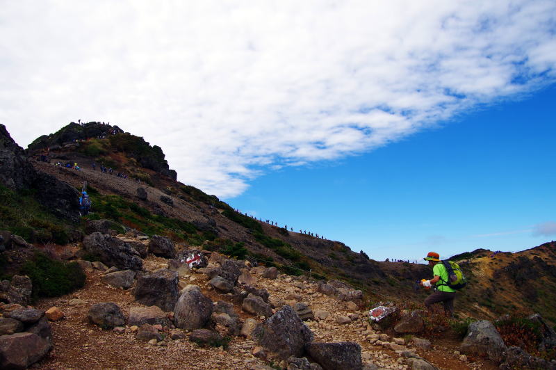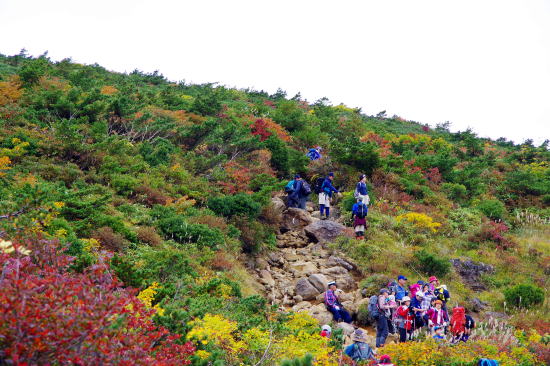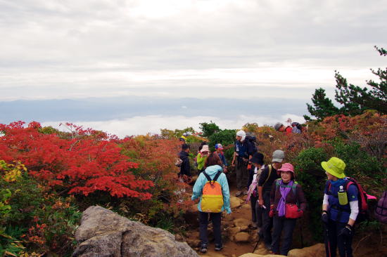 ここに載せきれない画像を YouTubeにUPしてあります。 →こちらから どうぞ。 Facebookも始めました。 →こちらから どうぞ。 こちらはPC版のようです。 スマホ版もUPしてありますが、URLの紹介方法が分かりません。 渡辺伸栄で検索してもらえれば出ると思うのですが。 ★ ★ ★ ★ ★ ★ ★ 関川村公民館主催の健康登山。 参加者40名、スタッフ4名、それにバス2台の運転手さん2名(麓で待機)、総勢46名の大団体。 朝5時半に集合して、約3時間半をかけてあだたら山の麓に到着。 列を作ってRWのゴンドラに乗込み、山頂駅の外に集結して、いよいよ出発。 隊長は、主管・阿賀北山岳会のIke会長さん。 前月14日の下見には都合で参加できなかったということで、この数日前、わざわざ一人で下見に来たというから、その責任感は人一倍。 団体登山は、とりわけ、何事がなくて当たり前。 変事があったら大大変。 それだけに、顔には出さねど、主催主管の担当者は細心の注意。 それに応えて、参加の皆さんも実に協力的。 中には、この日に備えて二王子岳に登って練習してきたと言う人も。 二王子岳の方が、安達太良山よりも優にきつい山。 少々オーバーに言えば、ハーフのレースに出るために、フルのレースに出て練習してきたようなもの。 その方、言うには、一人なら何時間かけようとも自分のペースで歩けるが、団体となればそうはいかない。みんなに迷惑をかけないように、事前に練習してきたのだと。 その心構えに、拍手、脱帽。 最年少は小学低学年。 最高齢は、傘寿を迎えたYoko長老。 Yoko長老と、山の同行は5年ぶりくらいか。 久しぶりの同行に、嬉しさ一入。 5年程前まで、山もスキーもご一緒させていただいていたが、その後、大きく調子を崩され、回復に専念されていた。 強い意志と科学的な思考で、見事に復活。 以前と変わらぬ笑顔と体力。 爪の垢をもらわねばならない。 例の、甲斐駒に登った女子中学生もじいちゃんと一緒に参加した。 道々、行き交う人に「こんにちは」「こんにちは」と、まめに声をかける。 何とも爽やかな態度に、わざわざ足を止めて、褒めたたえる登山者も。 それに応えて、「俺の孫だ」と誇らしげに告げるじいちゃん。 その得意げな顔。 何とも羨ましい限りだ。 Okkaaは、この翌日が誕生日。 いよいよ七十路へ突入の前日。 詳しくは調べていないが、もしかしたら、女性の中の最高齢者では? 本人は、記念の日の登山になったと、満更でもないふう。 なにしろ、六十代最後の日の登山、確かに記念だ。 それに、この6日前には、スズメバチに3ケ所も刺されたばかり。 その日は日曜で、やむなく翌月曜に診療所受診。 点滴治療で、どうやら、事無きを得たものの、刺された足はパンパン。 それでもゲラゲラ笑いながら登ったのだから、まあ大したものだ。 スズメバチに刺されるのは、これで3回目。 免疫ができているのだろうか。 かく言う小生も、今月末で、いよいよ七十路突入。 そろそろ人生の始末も考えておかねばならないお年頃。 断捨離を進めねば・・・おっと、その前に、新潟マラソン。 それが小生六十代最後の記念。 さて、どうなるか。 山にマラソンに、いつまで続けられるものやら。 Yoko長老の爪の垢が、ますます必要となるようだ。 そのYoko長老曰く、これまで何度となく安達太良山には来ているが、今日ほど晴れ渡った日は、初めてだと。 参加の皆さんの、普段の心がけがよっぽど良かったのでしょう。 「ほんとうの空」に、はしりの紅葉に、眺望に、雲海に、和やかな参加者に、大感動の安達太良山でした。 みなさん、ご苦労様でした。そして、ありがとうございました。 |