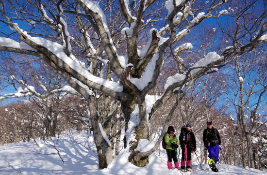 ![]() その巨木の下で、なおまだ新品のスノーシューを見せたがる人 |