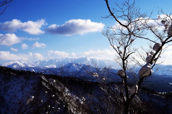 ![]() 山頂から、左に元光兎山、右に湯蔵山 4月残雪期に登る予定の山 |