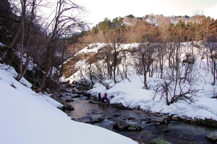 | 頭巾ルートの最初の関門、藤沢川渡渉点。ここで服と靴を濡らし、着替えや暖とりなどで停滞。頭巾山までは登りに6時間往復10時間超の予定。今日は無理と、ここで撤退することにした。とは言え、ただでは帰らないのが我ら。靴や衣類の不足分はそれぞれの予備の物品から貸し借りして間に合わせ、次の山を目指すことにした。山で渡渉の失敗は、まま起こりうること。めげずに、どのような事態が起ころうとも柔軟にかつ適切に対応できる、これぞ山岳会を名乗る所以というもの。かく言う小生も、渡渉が終わるまでと履いてきた長靴が劣化して穴が開いていたのを、川水で靴下が濡れるまで気づかなかった。入念に準備したつもりでも見落としはあるものだと、改めて戒めた。 | ||||