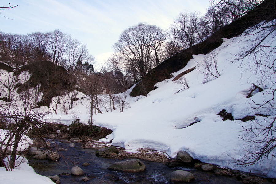 | 堀切を閉め切った堰堤上から門前川に流れる沢を見た。 現地に立てば、想像以上のものだった。尾根が最も低く、両川筋が最も接近した箇所に目を付けたことは分かるが、それでも尾根を断ち切り、流路を変え、沢を広げ水を落とすことは、相当の大工事だったに違いない。 藩主は堀丹後守、村上藩版図最大の時代。関川村ほぼ全域が藩領だったから文句の言いようもなかったのだろう。が、その後180年ほど経って、荒川流域が幕府領になっていたこともあり、新田開発の必要から訴訟となったものだろう。 それにしても、200年近い既得権に挑んだのはなぜか。門前川下流域の新田開発のため、分水が当初よりも大幅に拡張されたのが原因のようだ。だからだろう、幕府の裁定は、分水の当初目的である村上城の溜池用としてだけ許可するというものだったという。 とすれば、その後も分水は小規模に可能だったわけで、現在のような完全な締切堰堤を造ったのは、もっと後の時代なのかもしれない。残念なことに堰堤は雪で覆われていて、工事跡などは見られなかった。 いつかまた、頭巾山に挑戦する折りにでも、雪のない堰堤を見てみたいものだ。 |