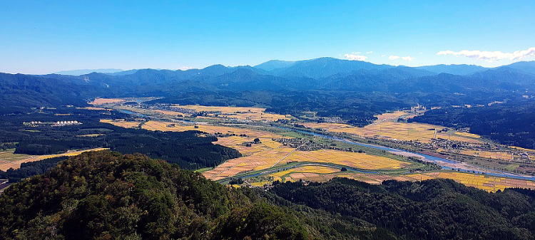 | 稲刈りが始まればこの光景は一変する。絶好天のこの日がラストチャンスと、朴坂山へ駆け上がった。眼下にUnqさんの家。今日は休みらしいから、この写真を送ってやれば驚いて飛び起きて、2階の窓を開けてこっちを見るだろう。 そうしたら、ズームで盗撮だ。などと悪戯心を起こしてラインで送ったら、豈図らんや、八海山にいると返信が来た。山岳会の山行に備えて、岩の八峰を乗り越えて下見中だったとのこと。いやはや、なんとも。400mの山の上にいるのがどうにも小粒に思えて身を縮めましたね。それにしても絶好天。山頂からドローンを限度いっぱい50m上げると、視界遮る木立の上、360度の大展望。盆地を取巻く山々、盆地の底からは見えない遠くの山々まですべて見える。杁の小屋は勿論、大朝日の小屋、鷲ヶ巣の2峰の間から以東岳が覗き、小屋まで見えた。若ぶな山の後方に横たわるのは吾妻連峰のようだ。日本海の海岸線の向こうには、粟島に佐渡。改めて女川の河岸段丘を見れば、くっきり5段。見事な土地利用、用水の威力。それは荒川両岸も同じ。この地に踏みとどまり、根を下ろし、生き続けた人々を思う。詳しくは「山の記」で。 | ||||