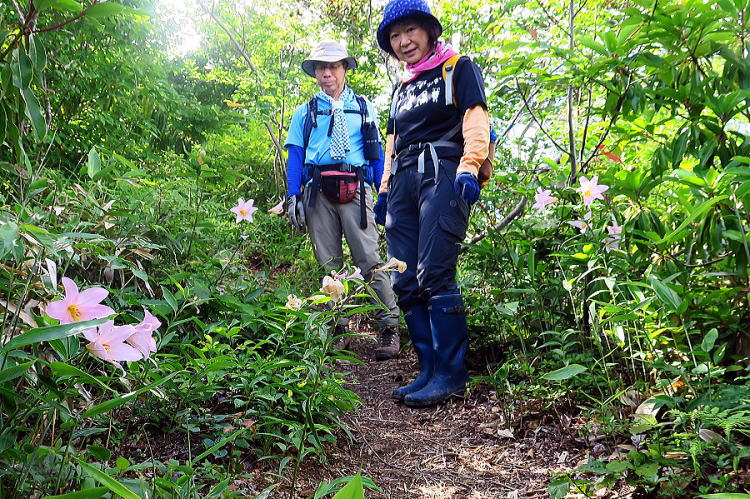 | 今年は花の移ろいが速い。黒沢峠の下見で咲いていた碇草も裏白瓔珞も4日後の本番では消えていた。今日は、来月5日予定の公民館登山の下見。本番は「姫小百合咲く鳥坂山へ」がテーマの積り。が、今日既に盛りを過ぎつつあった。本番当日はほぼ望みはない。せめて、此処にこんなふうに咲いていたと話だけでもしようじゃないかと、Unqさん。此処とはユズリハノ峰を越えた櫛形山脈縦走コースの一角。此処だけどうしたわけか、見事な群落。この後、下見隊4人は4コースに分かれて、それぞれ単独偵察隊。私はこのまま縦走コースを進んで、黒中山から黒中コースの登山口へ下山。久方ぶりの単独行。稜線歩きの気持ちよさ。足下眼下に黒川中の校舎が見えて、低山らしからぬ高度感。かつてあの学校の校長を務めた今は亡き旧友を暫し偲んだりして。詳細は「山の記」に。 | ||||