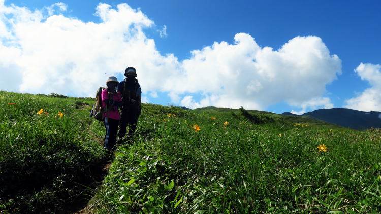 | ここは朝日連峰以東岳。初日はテント荷を背負って大鳥池まで標高差400mの荷上げ。その重いこと暑いこと。テント荷を担いだのは一年ぶり。足腰にズッシリと加重。おまけに、大鳥池からしみ出す水分で周囲は湿気むんむん。陽射しは炎熱。まさに釜茹での刑。さて、その翌日。大鳥池にテント荷を置いて、小ザック一つで以東岳へ。その身の軽いこと爽やかなこと。昨日とは大違い。おまけに、1600mの稜線に上ってみれば、そこは天空の花園。これほどの花盛りとは、想定外の極楽園。行く先行く先、ミヤマリンドウがびっしり。星のように散りばめた花あり、かと思えばブーケのような塊あり。稜線道の両側、何処までも何処までも紫の星の道。さらには、ヒメサユリとニッコウキスゲのコラボレーション。思わずブラボー、アンコール‼。それに応えて、出てくる出てくる。緑の草原にピンクと黄色の配色。次はなんだ?おお、キンコウカ。これは草原の黄色の星。トキソウにオノエラン。ミヤマダイコンソウにタカネマツムシソウ。もう秋の花。百花繚乱千紅万紫とはまさにこのこと、いやはや驚きましたですねえ。 | ||||