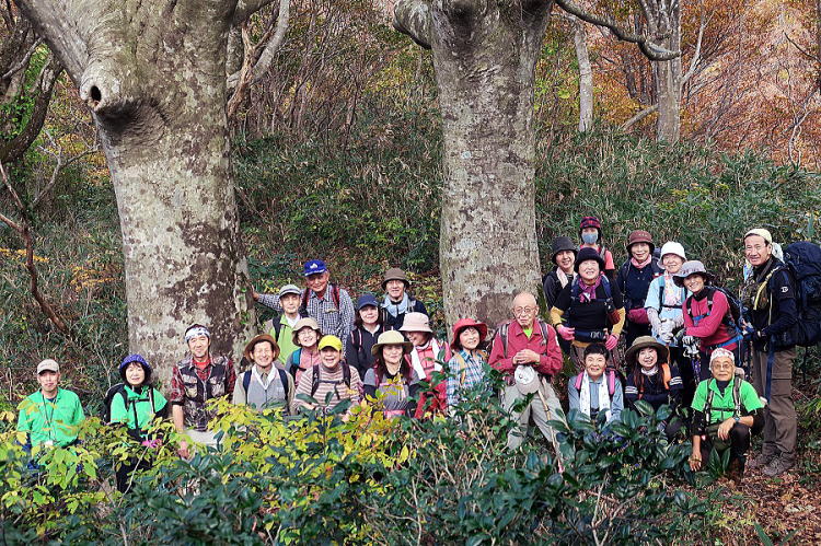 | 公民館登山の今日が本番日。絶好の晴天に恵まれた。下見から1週間、山の紅葉はグンと進んでいて、オミゴト状態。下見の山頂で震えながら昼食を摂ったのがウソのような温さで、木々の色を愛でながら秋の山中を歩く。高坪山縦走の見所は何と言ってもブナの巨木たち。巨木ゾーンの入口に、さながら守衛の門のような二本の巨樹。まずは、その下で全員集合、記念撮影。まさに老若男女に善男善女。二枚目の画像は、そこから山頂を越えて3,4㎞進んだ先に、最近発見されたという巨木。見たところ、この巨木が一番の巨大さではないかと、衆議一決。それにしても、胎内川から荒川を繋ぐ山上の架け橋・高坪山完全縦走、行程10㎞、累積高度差900m。山頂の標高570mに似合わない長行程をものともせずに歩き通したこの一行の健脚ぶり。さしもの巨樹たちも脱帽状態でした。途中の巨樹の下で和やかなグループ写真も撮れているのですが、紅葉の写真も含