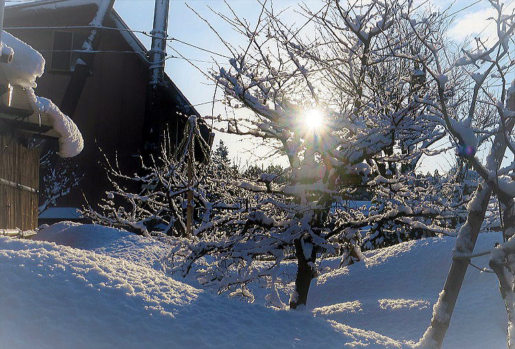 | 夜半まで続いた吹雪。今朝は一転して陽射し。見事な舞台転換。今朝が五頭山なら6年前の「山頂の光と雪のページェント」と題したあの写真(⇒こちら)が撮れただろうに。などとブツブツ独り言、朝風呂から帰って、急ぎカメラを持ち出し、庭の木のあちこちをバシャリバシャリ、今年は未だ一度も山行なしだから、このカメラを切るのも今年初めて。庭に積もった雪は固くてスコップも歯が立たず、自然解凍を待っている。予報では、月半ば過ぎにもう一度寒波が来るらしい。ヤメテクレー、雪ハモウ イ・ラ・ナ・イ! | ||||