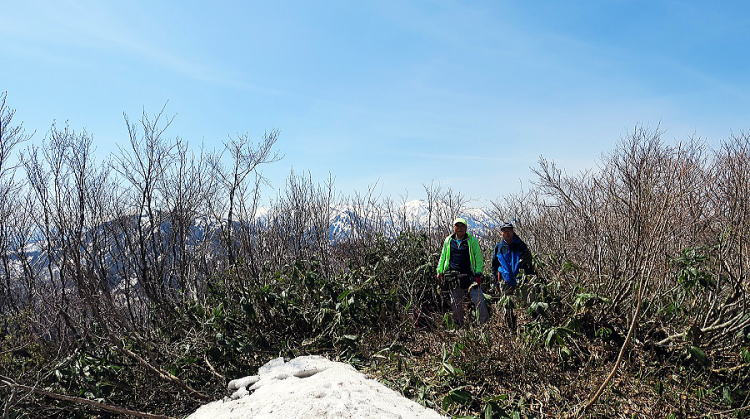 | ここは標高630m若ぶな山山頂の三角点。薮の中のように見えるが、少し先へ出ると飯豊連峰の大展望台。二王子から杁、飯豊本山まで一望。その手前には葡萄鼻から大境への稜線が連なる。眼下には大里峠。そして、180度向きをかえれば、朝日連峰。祝瓶に大朝日三山、以東までの稜線。さらに登ってきた道の下には若ぶな高原スキー場、その先に関川盆地、さらに先に日本海。葉の茂る前の今なら360度の大パノラマ。しかも、スキー場上部の電波塔から登山道もしっかりついている。こんないい山に、公民館登山でぜひ来たい。 ところで、今日の本当の目的は、この山の下を流れる荒谷川の深い谷を越えて金丸へ出る古道・茅峠越えのルートを探ること。この後、一旦下山して車で金丸へ行き、そこから対岸の茅峠の峰へ上がり、谷を越えるルートの目星をつけた。久しぶりのChuzyさんとの藪漕ぎ登山。それどころか、金丸では、旧知の方々に何十年ぶりでお会いして、懇切丁寧に茅峠への道を教えていただいたり、さらには、さざれ石を頂いたり、ちょうど祭りだからと赤飯まで頂いて、いやはや、盆と正月と祭りと誕生日が一緒に来たような嬉しい日になった。詳細は「山の記」で。谷越えの本番は来週の予定。 |