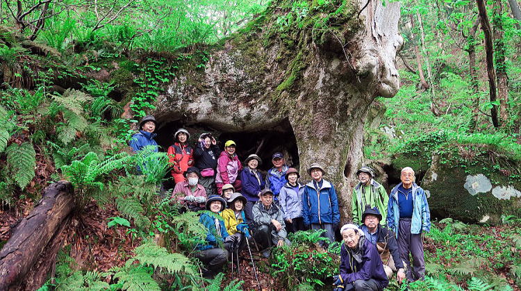 | 前日下界は黄砂で霞んだ。にもかかわらず、この日、深山の緑はしっとり艶やか。2年ぶりの沼奥山の巨木ツアー。巨木1号は相変わらず30m近い巨体ですくっと立って迎えてくれた。巨木2号の下へ行き、洞穴の前で集合写真。見上げれば、頭上から見下ろす穏やかな目、口、鼻。シシ神だという人あり。確かにこれは森の精霊・森の化身。山に棲む無数の動物、無数の樹木、無数の草花の集合体。「我と共にあれ!」ふと聞こえたような。圧倒されんばかりの巨木を「山の記」で感じ取ってください。 | ||||
