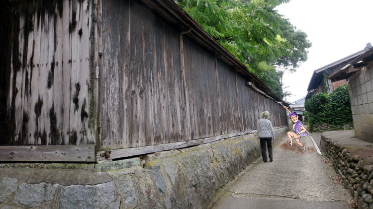 | 荒川河口の海老江は旧湊町、今は昔、出船入船大賑わいの地。その痕跡を探して村内探訪。幕府の御米蔵跡、館林藩の陣屋跡、船着場、水際線・・・そして、ここは廻船問屋だったかつての大地主の邸宅。秋の風が邸内の巨木の葉をゆらしたそのとき、櫓を背負った船頭さん一人、狭い小路を駆けて湊へ急ぐ。夕べ、花街で遊び過ぎてどうやら遅刻の態。いきなり振り返って、「姐ちゃん、どこへいく?」 酒の香と三味の音が風に乗って流れたような、ふとそんな気にさせる小路。 | ||||