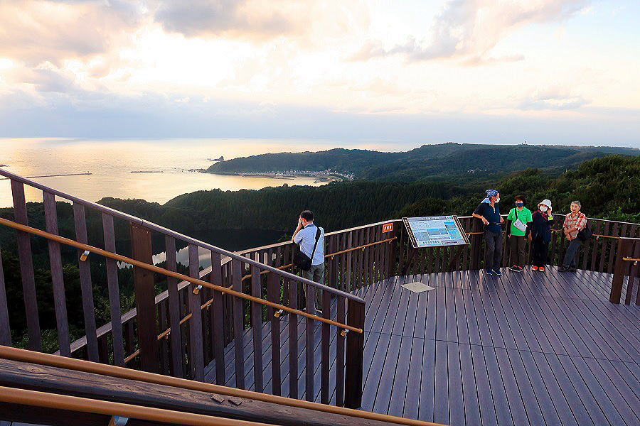 | 戸賀湾を一望できる八望台。展望台の左すぐ下に見える水面は二ノ目潟。水蒸気による爆裂火口で周囲が山にならなかった地形をマールというのだとか。一ノ目潟、三ノ目潟も周りに散在する。展望台の隣に「八望潟をもりたてる店」と大書された看板の懸った店があった。どうやら廃店の風情。かつては大いに盛り立てたのだろうが、灯台のようにサバサバ、スキッと、というわけにないかないように見えた。 | ||||