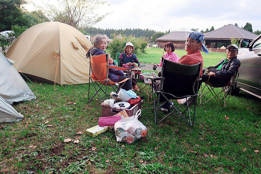| 初日の泊地は、入道崎近くのナマハゲオートキャンプ場。本来は田沢湖まで駒を進めて湖畔にキャンプする計画だったのだが、寒風山で電話を入れたら、満杯と断られた。どこのキャンプ場も、コロナ対策で人数制限予約制。それで急遽近くのこのキャンプ場に電話を入れて、予約を取った。来てみれば、大型キャンプ場のここも家族連れで満杯状態。コロナを避けて、キャンプが大流行のよう。ファミリーキャンプの大型テントが林立する中で、我らの登山テントはどうにも場違い。その上、入道崎で夕食を食べてきたから、静かに静かにティータイム。バーベキューで大賑わいのキャンプ場の中で、煙一つ立たない異様な雰囲気の一角となった。 夜半に驟雨。テントの中で聞く雨も、嫌いではない。それに、雨に濡れた重いテントを翌日担いで登山となればこれは大ごとだが、車に積むだけだから気が楽な雨。 |