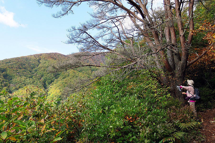 | 650mを越えたら雲の上に出たらしく、空は青空。沢筋を挟んだ対岸に下山路の尾根。その上方に葉山の山頂稜線が見えて、色づいた紅葉が手招きして見えた。 |