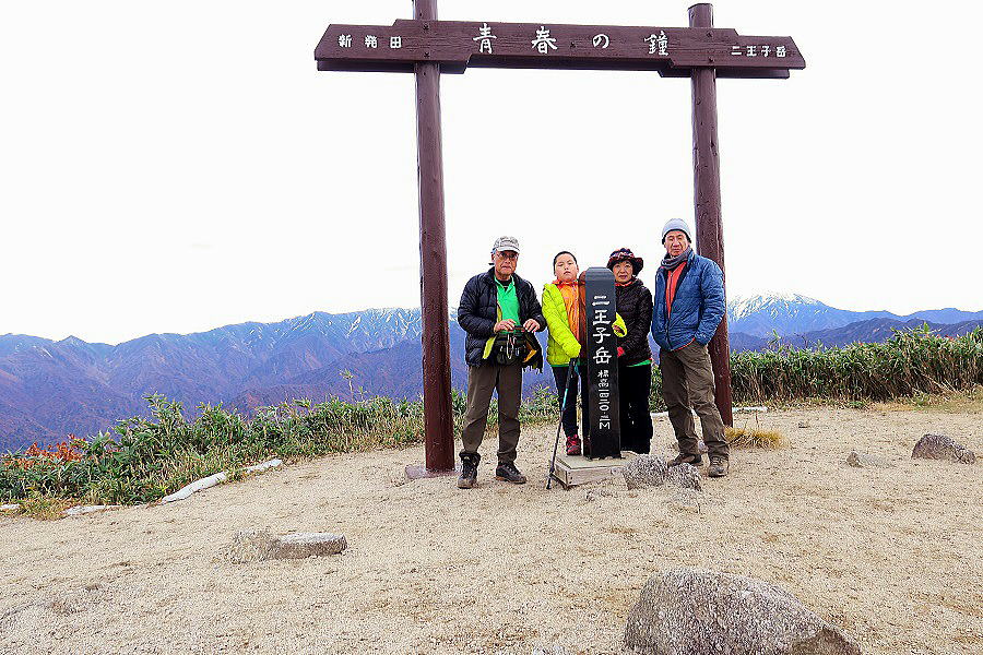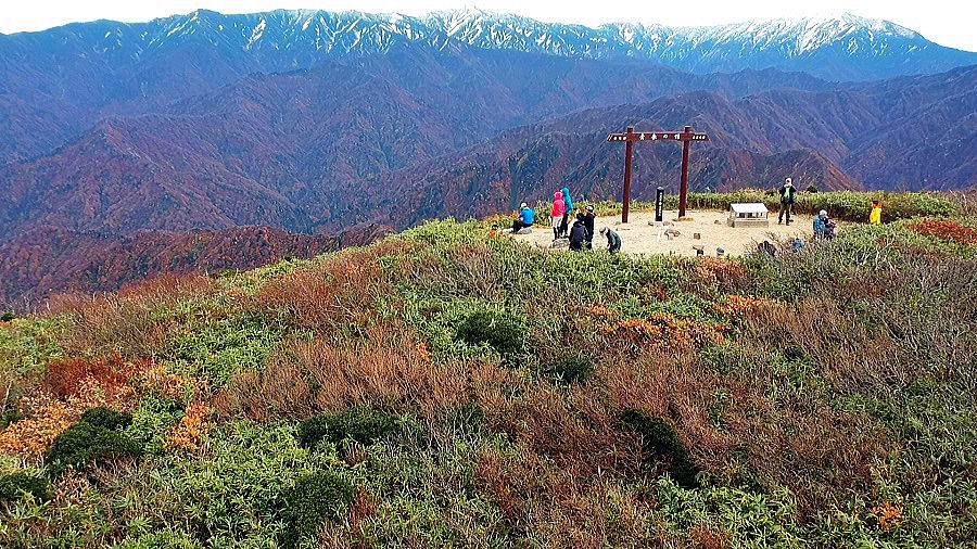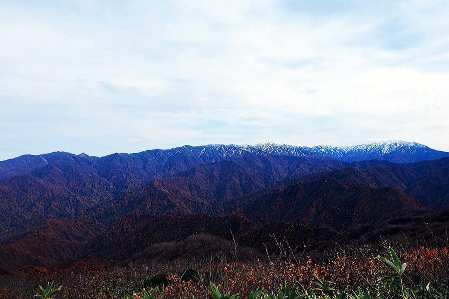 | この日の予報が滅法良くて、急遽二王子岳へ。Ibu少年は9歳ながら立派な阿賀北山岳会隊員。期せずして最年少隊員と最年長隊員が、最強隊員2名と同行することになった。登り始めはまだ緑の混じる樹林、登るにつれて紅葉の色が増し、500mを越えると枯葉色に変わり、1000mではすっかり葉を落として冬枯れの木立。この時期ならではの季節の垂直変化を体感できた。山頂稜線に出れば、快晴というわけでもないのに、360度の大展望。眼前に横たわる飯豊連峰は端から端まで手に取るよう。北遠くに朝日連峰が全貌を晒し、その向こうには月山。そして、下山の頃には鳥海まで姿を露わにしてくれた。南を見れば、遠くに特徴ある双耳峰、あれは尾瀬の燧ケ岳。その右方に越後駒と中ノ岳がくっきり。やや手前に越後白山、粟ヶ岳、守門岳。那須連山も日光の山々も見えているはずだが、際立った特徴なく識別は難しい。日本海には朧ながら佐渡島に粟島。足下には我が関川村の盆地、光兎山、鷲ヶ巣山、その延長線上に鳥海山。ぐるりと360度、何度回っても見飽きない光景。飯豊の稜線上には、杁小屋、頼母木小屋、御西小屋が見えて、手招きしていた。飯豊縦走、来年こそはと思いが募る。 |