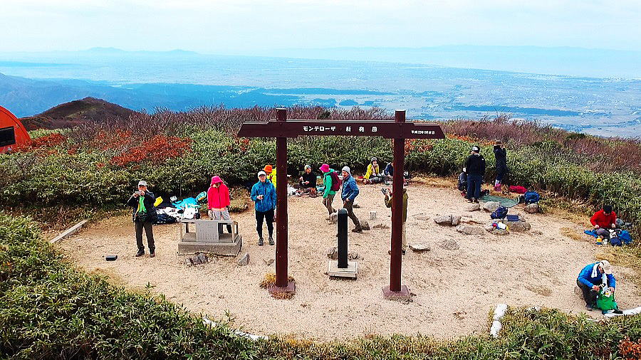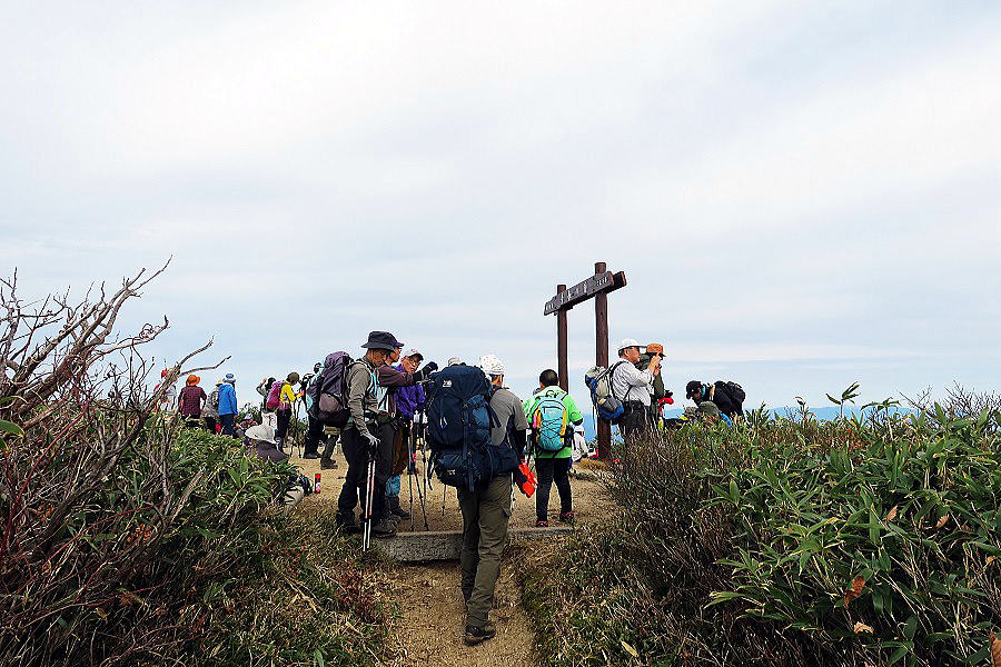 | 山頂に到着。登山口から休み休みで4時間ちょっと。ヤマプラの標準タイム4時間とほぼ一緒。山頂は登山者でごった返し。あの車の数だから立錐の余地なしかと思いきや、早く来た人たちがどんどん下りていく。予報では本日の晴天は午前だけ。だからだろう。お陰で、正午ごろにはガラガラ状態になった。風のあたらないブッシュの陰を占めることができて、ゆっくりと山頂時間を過ごす。 |
