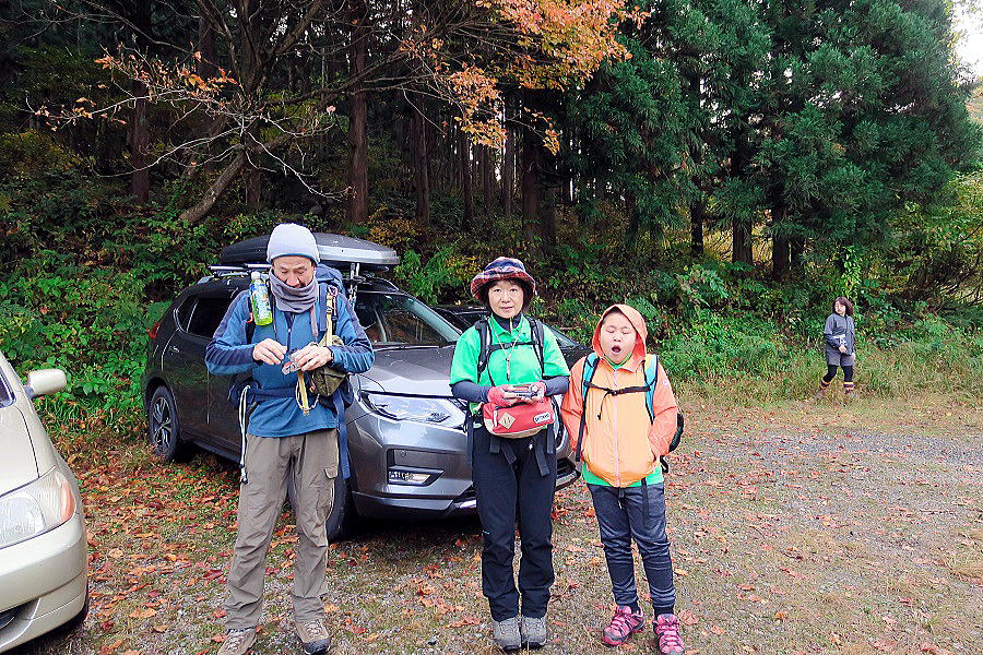 | 朝7時の登山口駐車場はすでに満車状態で、駐車は最奥部。それでも、その後も続々と車がやってくるのだから驚いた。どうやら絶好の日に当たったらしい。今朝6時に我家へ迎えに回ってくれたから、Ibu少年の起床は多分5時くらいだろうか。長~い一日になるぞ。 |