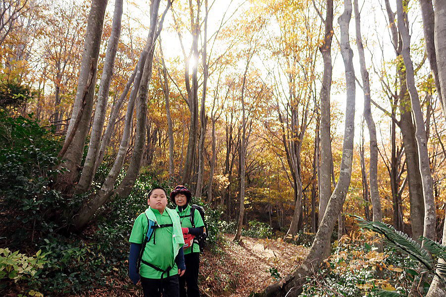 | 一王子の休憩を過ぎて、ここは標高800m付近。もう500mも高度を上げた。黄色く色づいたブナ林の葉を透かして朝日が林床まで届いてきた。温もり始めた朝の空気を胸いっぱいに吸い込む少年。 |