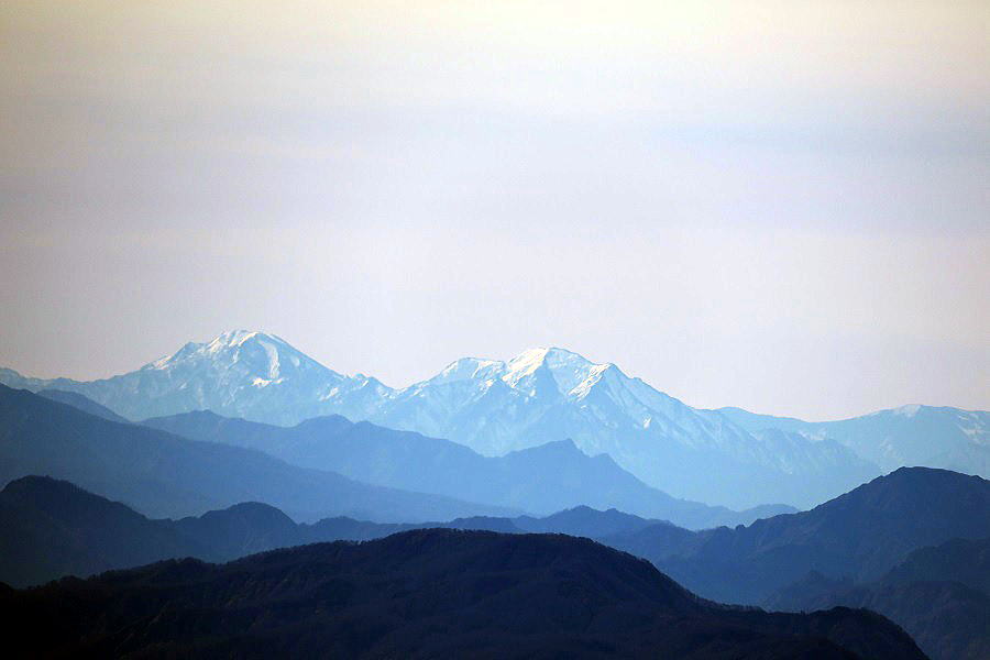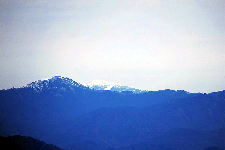 | さらに南へ目をやれば、遠く微かに特徴的な双耳峰。方向といい形といい、あれは尾瀬の燧ケ岳。とすれば、その前面に横たわるのは会津駒や会津朝日岳だろうか。 |