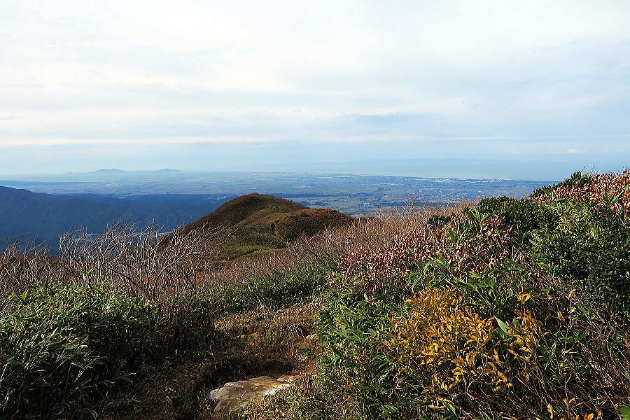 | 振り返れば眼下に新潟平野と海岸線、角田と弥彦、日本海に微かに佐渡島が見えている。残雪期にここの稜線上をスキーで下ってから、もう5年になる。この先の窪みで右折して油こぼしの坂へ向かうべきところを、勢い余って直進し、あの峰の先端まで行って下ってしまった。Unqさんに呼び止められて、ほうほうの態で戻ったが、あのまま下ったら大変なことになるところだった。終生忘れられない苦くも痛快な思い出の場所。 |