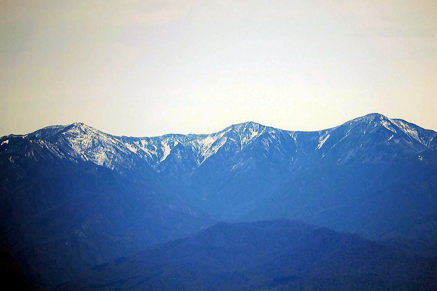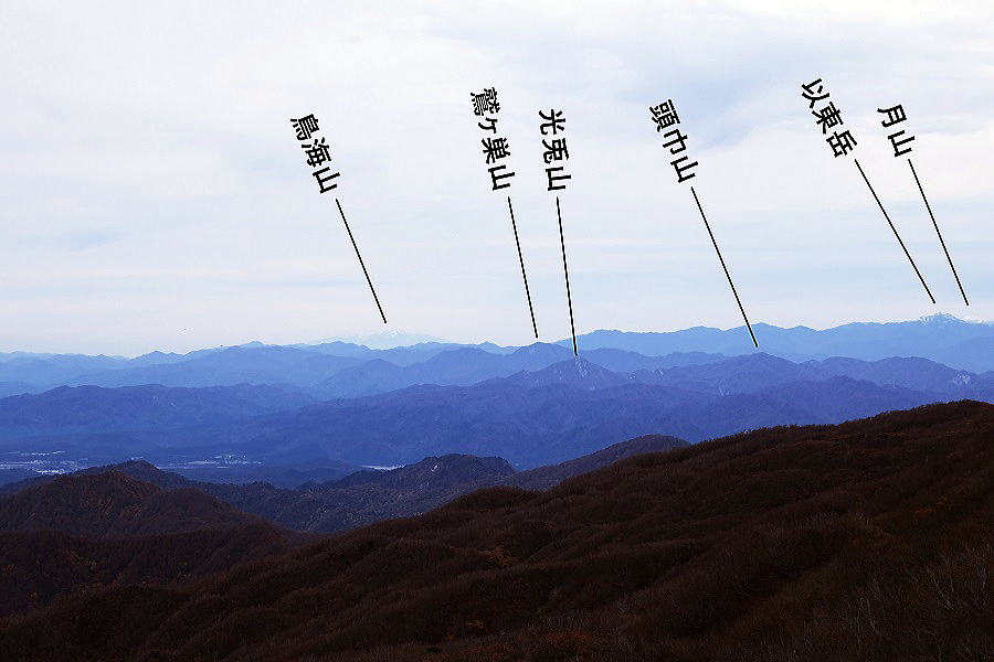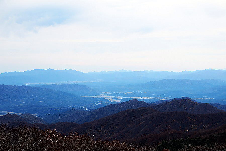 | 南方に目をやれば、見知った越後の山々。右手前は五頭や菅名の山塊で、中央が越後白山、その左が粟ヶ岳、さらに左奥に守門岳。4月に雪上を歩いた日本平が守門のずっと手前にあるはずだが、あの平らな黒い影がそうだろうか。 |