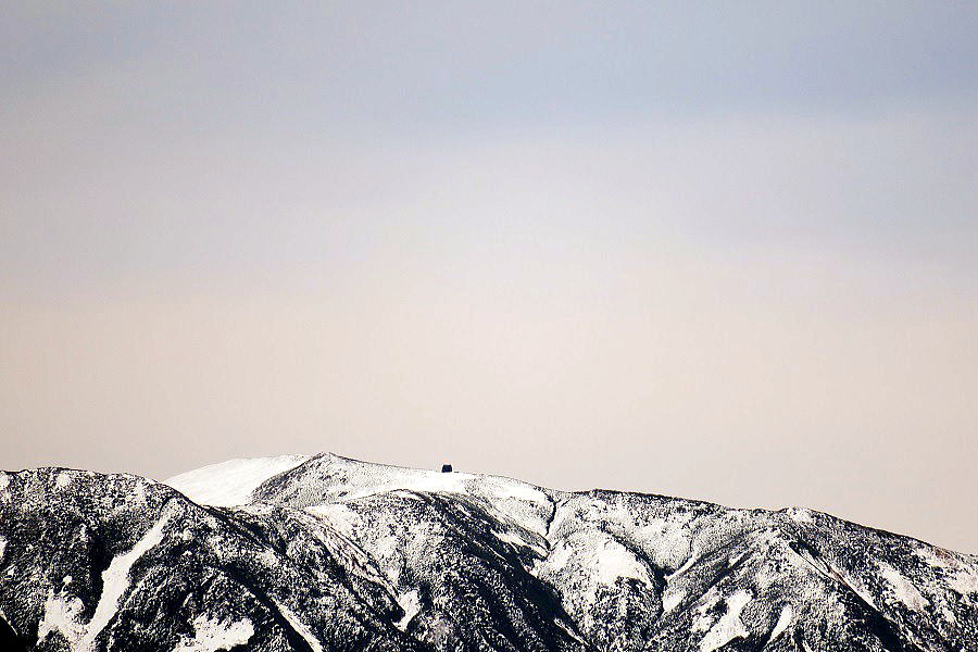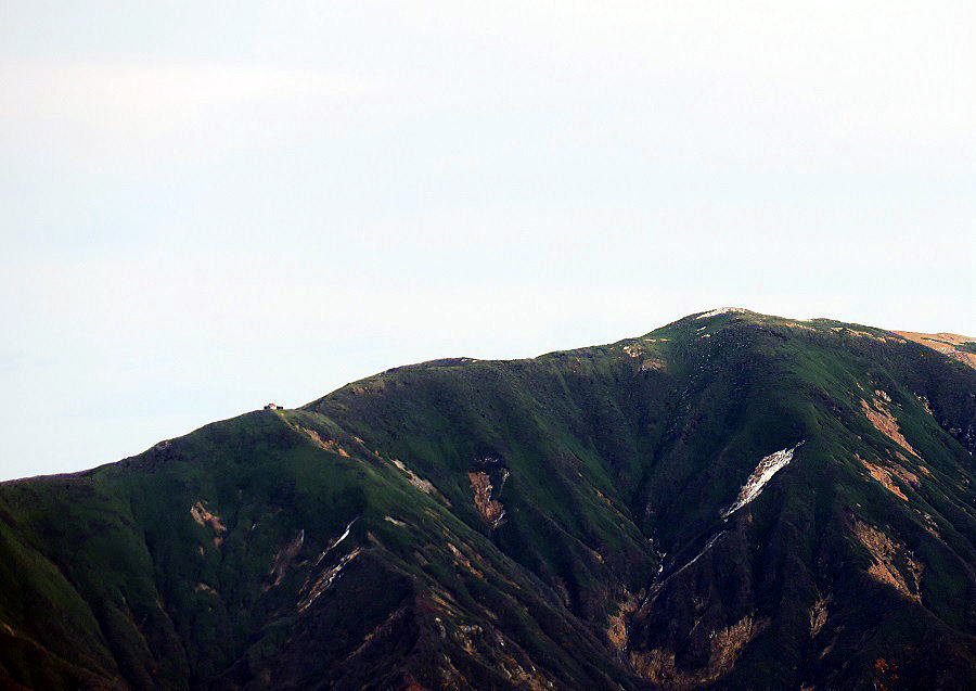 | 大日岳と本山の間の稜線に目を凝らすと、ポツンと黒い点。ズームで見れば御西岳の避難小屋。本山を経由して大日岳に登るには、あの小屋が頼り。大日には20代の頃に登ったきり。来年こそ。 |
