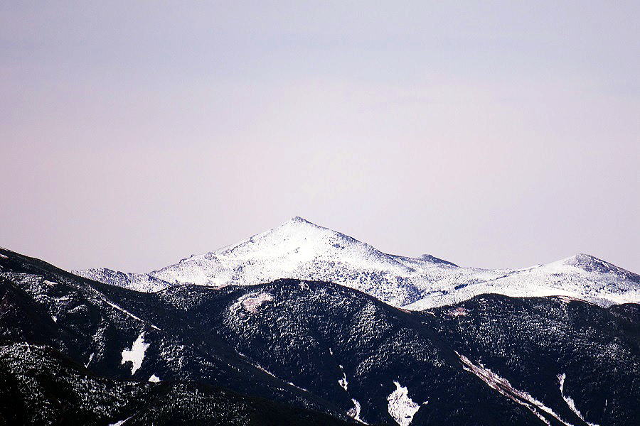 | 以東岳の後方に真っ白な月山が顔を出していた。ずっと以前、独りで二王子に登った山頂で北方に真っ白な山が見えて、見知らぬ登山者たちとあれは月山か鳥海かと論じ合ったことがある。ちょうど今頃の季節だった。今なら、あれは月山だとはっきり言える。じゃあ鳥海は?と遠目を凝らして探すのだがなかなか見当たらない。 |