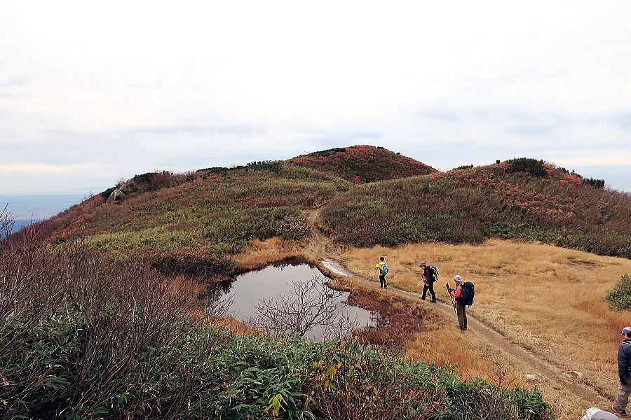 | 油こぼしを難なく登り切って山頂に続く稜線に出れば、大きな池塘。水泳に通うIbu少年、水にはことのほか興味があるようで暫し留まって動かない。じっと水面を見る。いや、水中に何かを見つけたのかも。山頂がすぐそこに見えている。 |