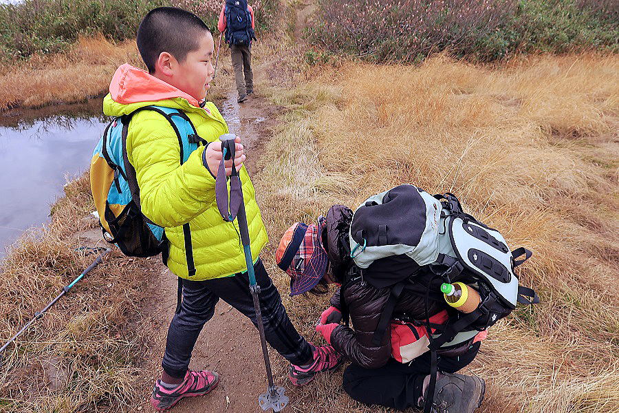 | 間もなく稜線と別れて油こぼしの坂へ、本格的な下りが始まる。というわけで、靴ひもを縛り直してもらっている少年のこの表情。なんとも嬉しそうではありませんか。 |