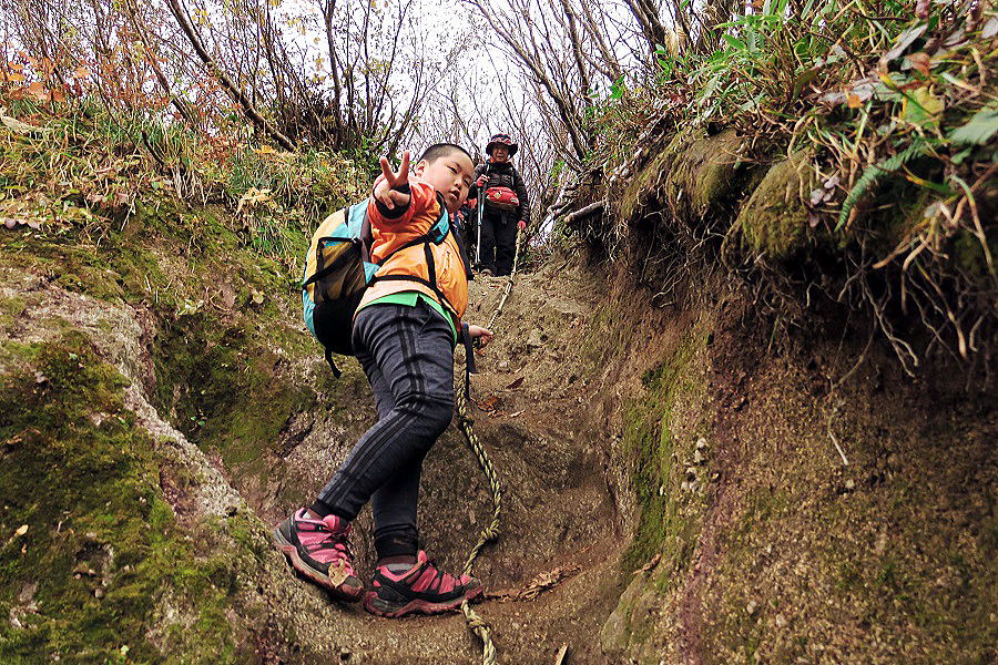 | Ibu少年、下りも油こぼしの坂を難なくこなして、ピースサイン。9歳最年少ながら、さすがは阿賀北山岳会の会員。弱音はちっとも吐かなかった。 |
