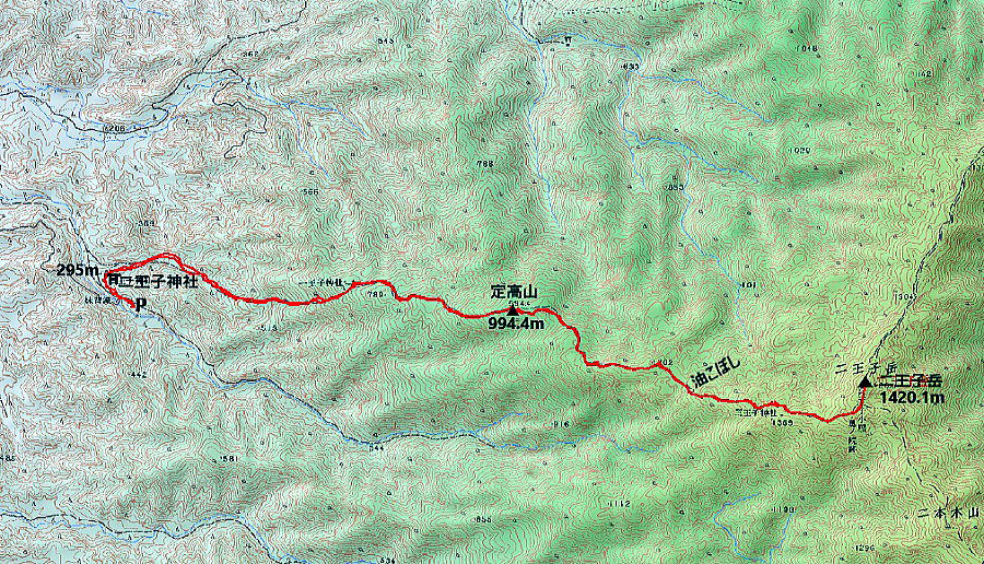 | <コースとタイム> 駐車場発7:03-7:10二王子神社登山口7:15-8:39一王子8:43-9:32定高山9:41-10:37油こぼし-11:05三王子-11:32二王子岳山頂12:51-13:49油こぼし-14:41定高山-15:16一王子15:31-16:41駐車場着 |