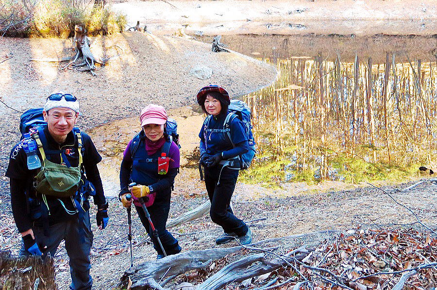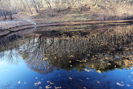 | 帰りは三峰沼へ。何のことはない、農業用水の為の溜池。と、記念撮影しながら、ふと水面を見てびっくり。ここは、鏡池。この逆さ景色はすごい!下の画像、左右、どちらが正でどちらが逆か、分かるかな? | ||||