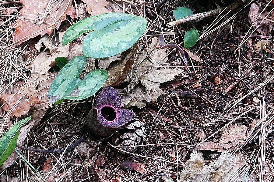 | 一息入れた休憩地点で、偶然、足下に越の寒葵の花。写真をとるために松ぼっくりを枕にして上を向いてもらったところ。 |