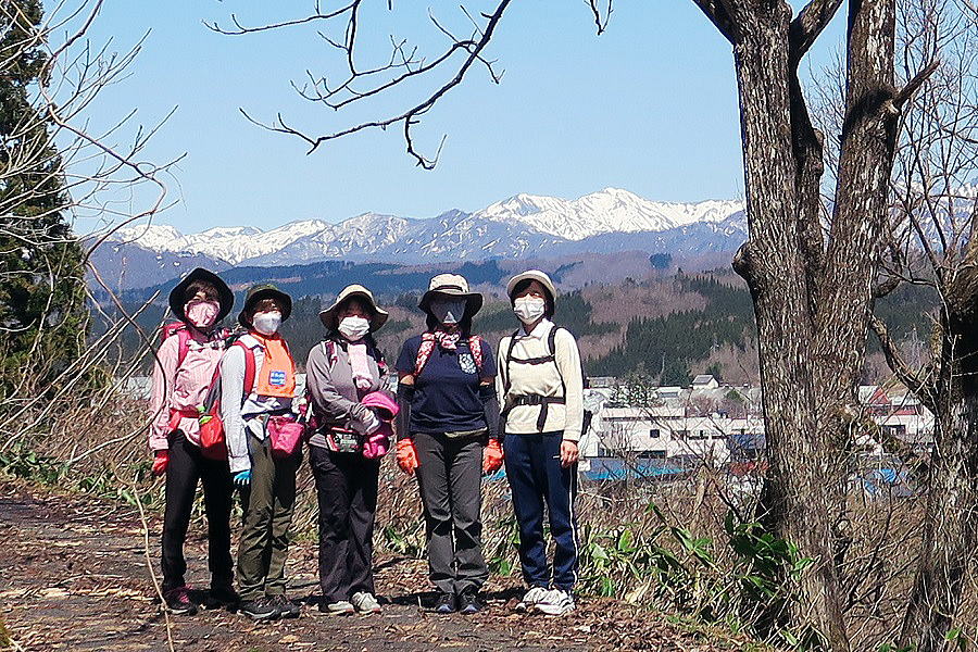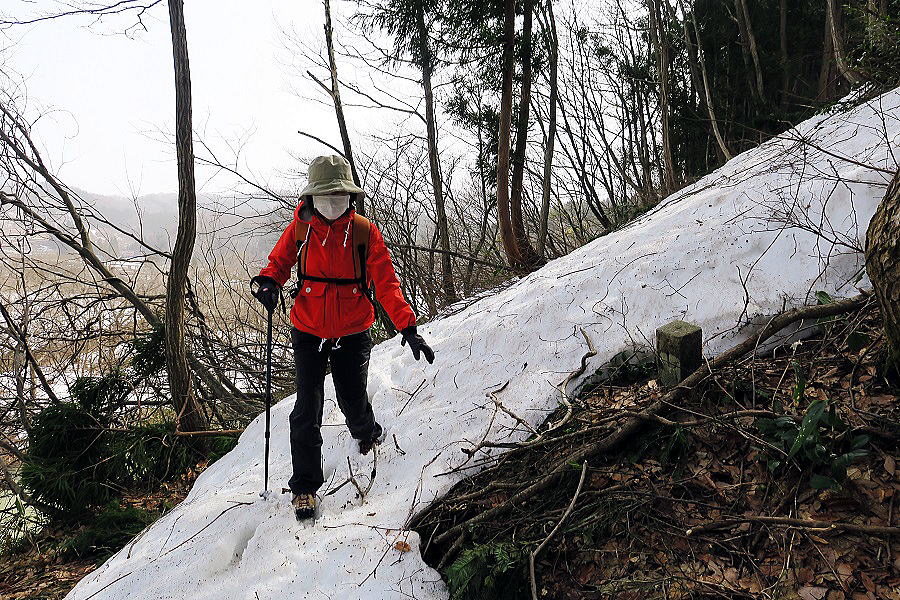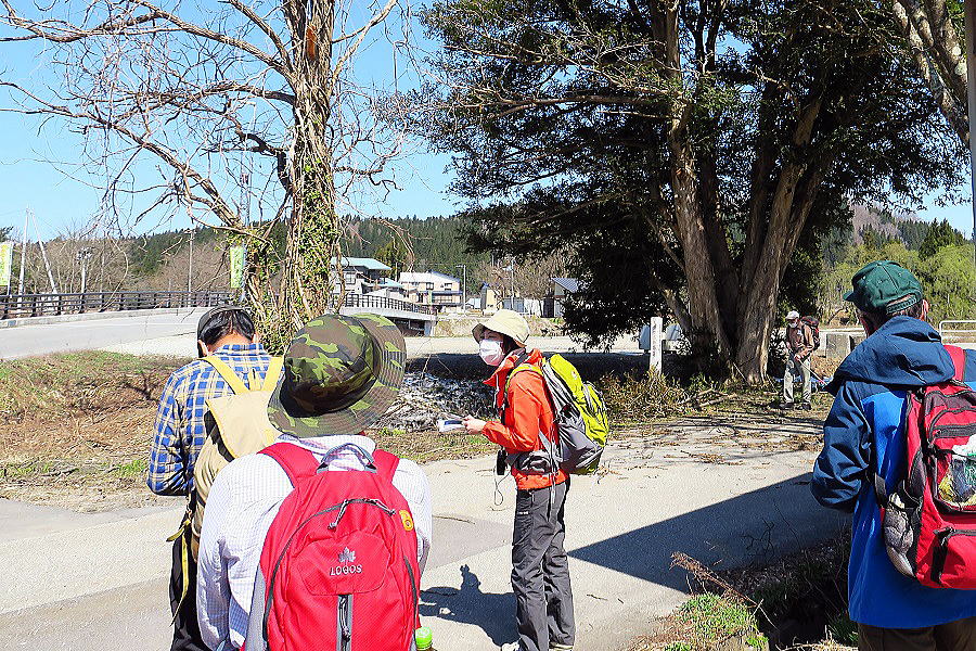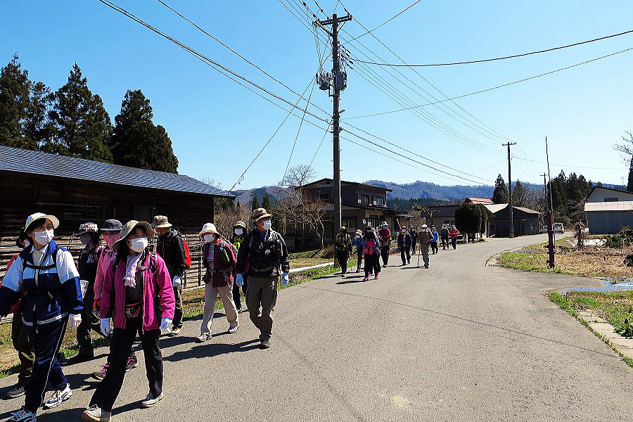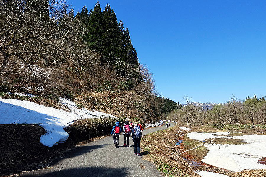 | 十三峠を歩く会、今年度の第一弾。ここは、越後側から第6峠の高鼻峠。旧街道は舗装道路に改装されて車道になっていたが、幸いなことに積雪期の車通行止めのままで、道一杯に広がってのんびりと街道歩き。空は快晴、林内には残雪、空気は冷たく、陽射しは温か。削られて崖になった第7峠の貝ノ淵峠は、崖下の舗装道路から眺め上げただけで、のんびりのんびりと歩いてここまで来て記念撮影。このあと上杉神社前で昼食休憩して、午後は小国町の旧宿場街へ入り、武家屋敷町跡や御城の跡を探して、一日歩き尽くし。総歩行距離8km、高低差40m、山登りなしのウォーキング会でした。 |
