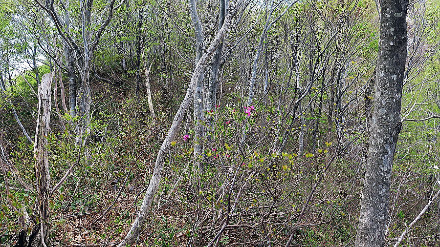 | 金丸からの尾根登り、5日間で、新緑がうんと濃くなり、コブシは開き、ムラサキヤシオの花も咲いていた |