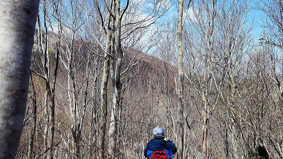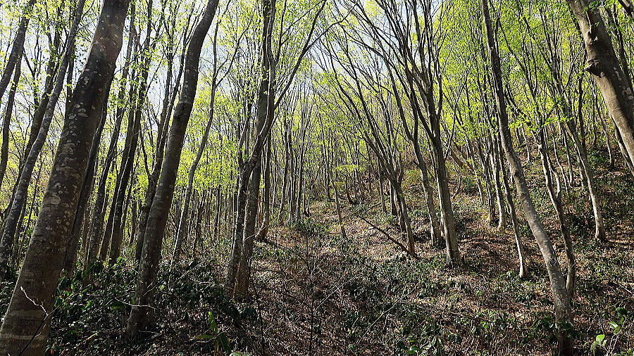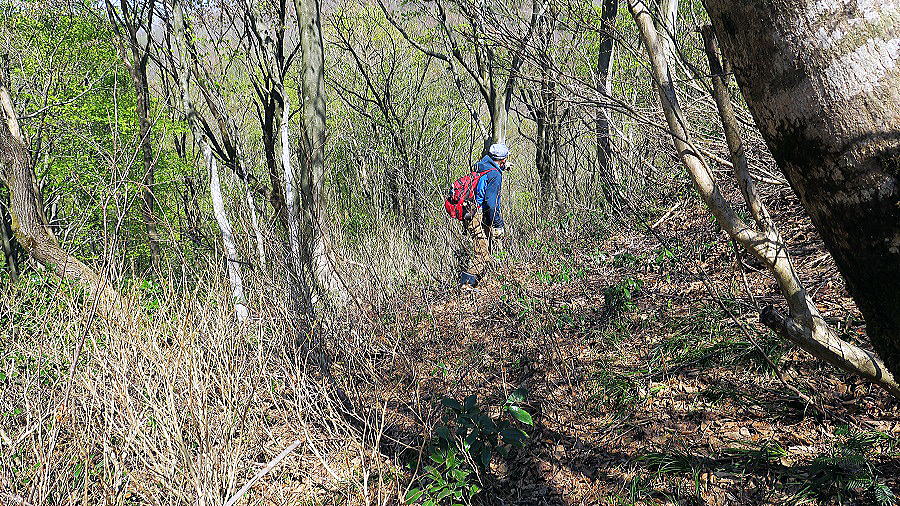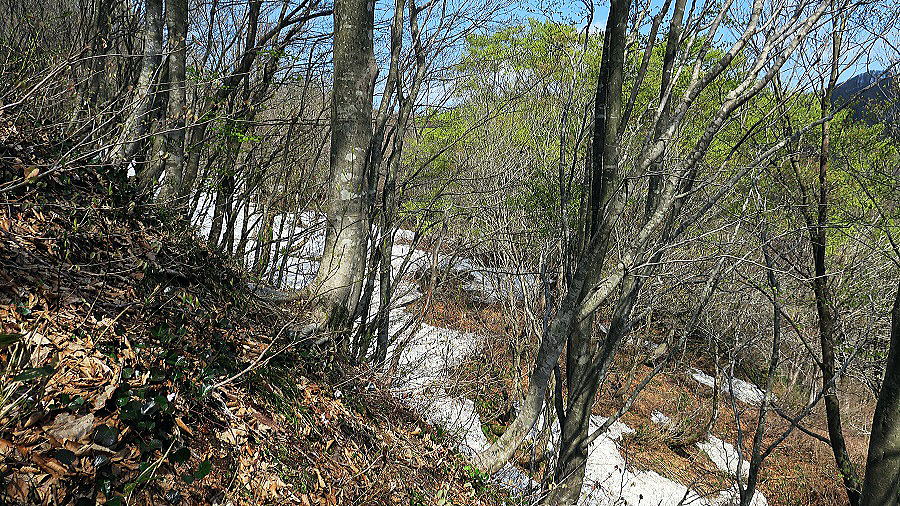 | 峠から北方向へ斜面を横断しながらゆるく下る道痕が残っていた。横断道は雪に押された細木が蔽いかぶさっていて、歩くには難儀をする。消えては現れる道の痕跡を楽しみながら薮を漕ぐ。最も難儀したのは、このような雑木林ではなく、植林した杉林。熊に皮を剥がれて枯れた倒木が縦横無尽に行く手を塞ぐ。この辺りの植林を管理していたというHさんが見たら嘆くだろうな、などと言いながら障害物を越えて進む。その点、ブナ林の中は歩きやすい。夏の葉が茂れば下の雑木は茂れないのだろう。葉のない今の時季は林床は明るく、芽吹きのミドリは柔らかく、歩くには最適期。 |