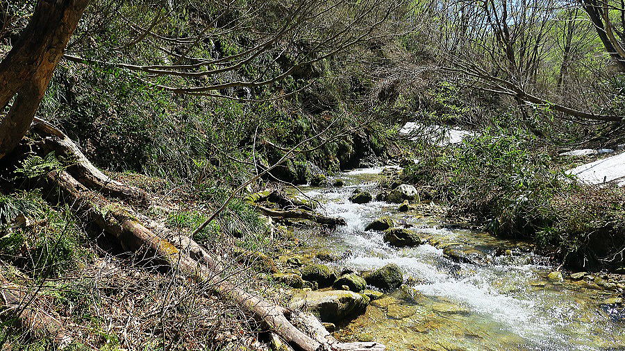 | 標高350mまで下ったら、ようやく沢の水流が見えた。どうやら酷い崖にはなっていない様子。これなら降りられると、ほっと一安心。 |