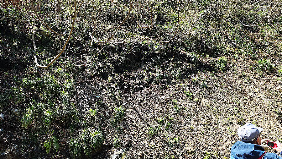 | 2m弱の崖を降りたら崖を削った道の跡。間違いなく旧街道の跡を辿っていると妙に自信が湧く。Chuzyさんが一心不乱に撮っているのは・・・ |